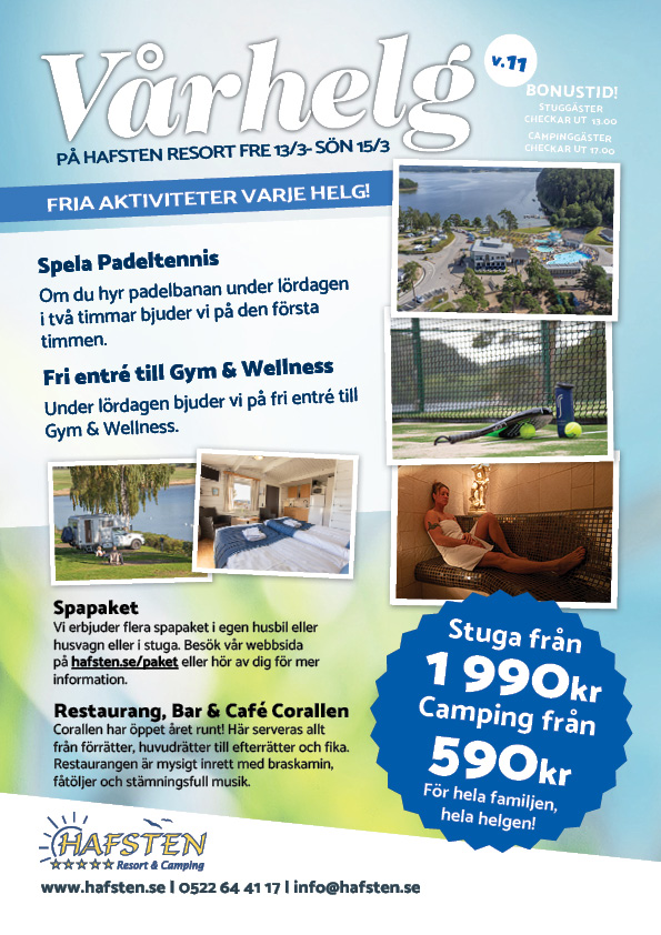 Du visste väl att vi har en padelbana hos oss på Hafsten? Så ta en utflykt hit och utmana familjen eller kompisarna på en runda padeltennis. Om du hyr padelbanan under lördagen i minst två timmar så bjuder vi på den första timmen.