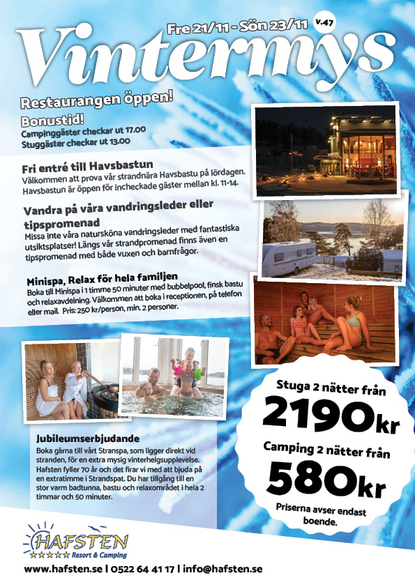 Boka till Minispa i 1 timme 50 minuter med bubbelpool, finsk bastu och relaxavdelning. Välkommen att boka i receptionen, på +46 (0) 522 64 41 17 eller info@hafsten.se. Pris: 250 kr/person, min. 2 personer.